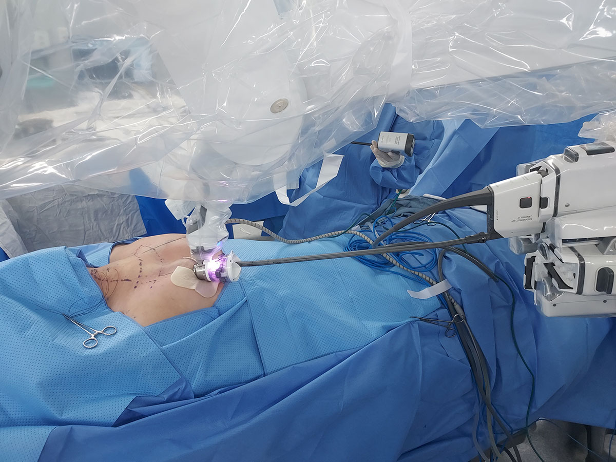 In this procedure, patients are positioned with their necks extended under general anesthesia. Intraoperative neuromonitoring is conducted using a NIM-3.0 endotracheal tube (Medtronic). The blueprint for the flap can be seen in Fig. 1. The da Vinci SP robot is docked through a 3-cm incision in the right areola, which allows access to both thyroid glands. An additional small incision in the left areola served as an auxiliary port. This port accommodates an 8-mm metal trocar, similar to those used in the da Vinci Xi, as illustrated in Fig. 2. A subcutaneous flap is created, and a suction irrigation tube or gauze ball is inserted through this port.