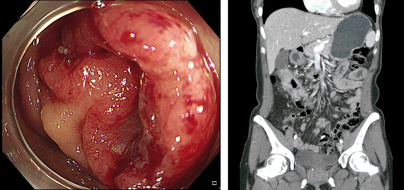 Figure 1.Initial colonoscopy and abdominal computed tomography images.